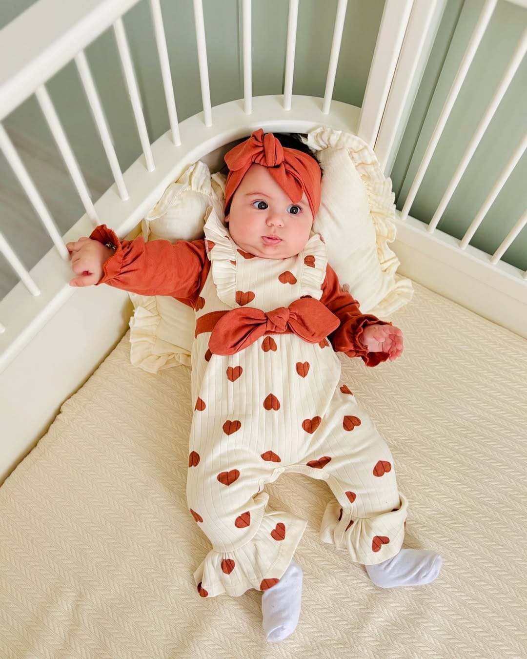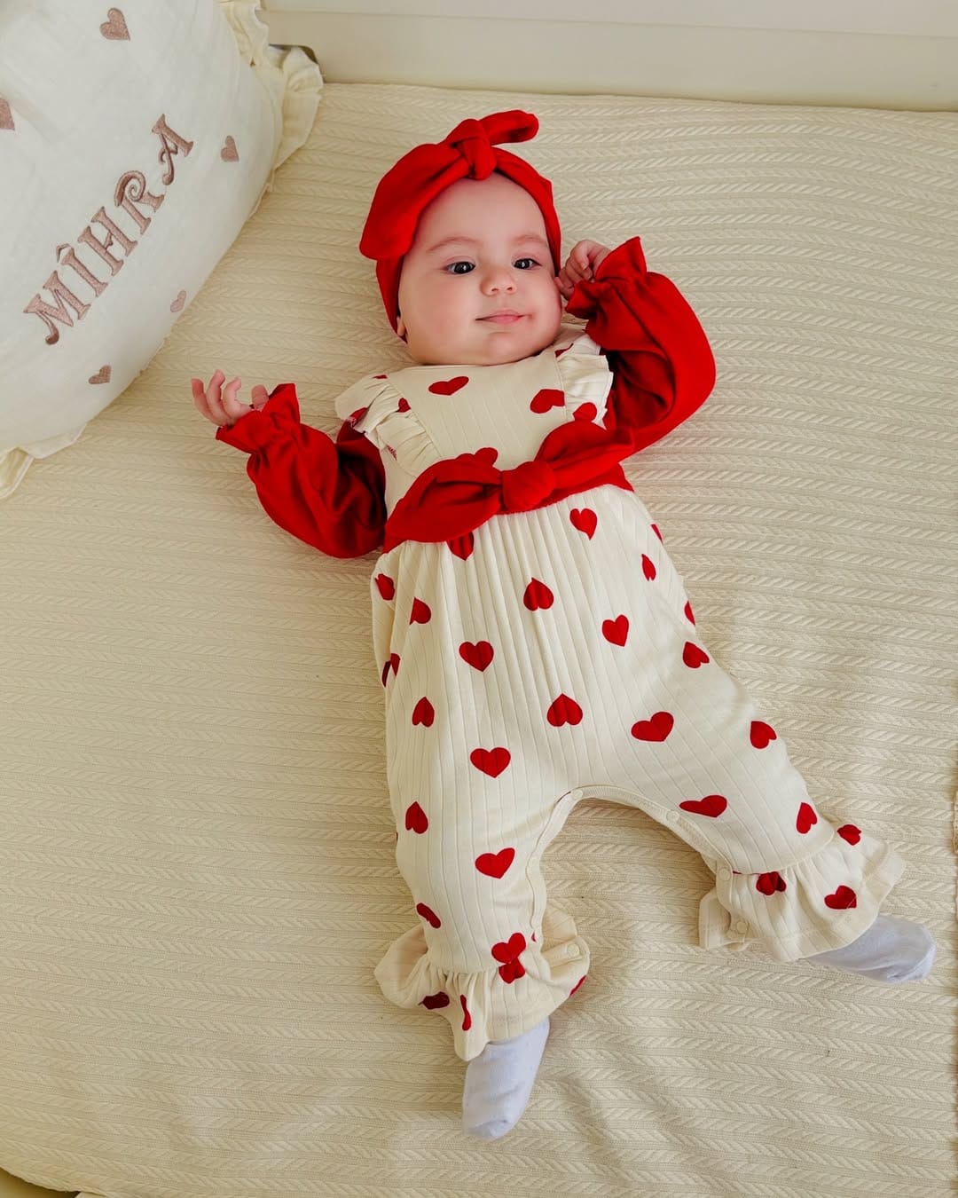 Ce joli encemble blanc à cœurs rouges, accompagné d’un haut assorti et d’un bandeau noué, enveloppe votre petit trésor de douceur.