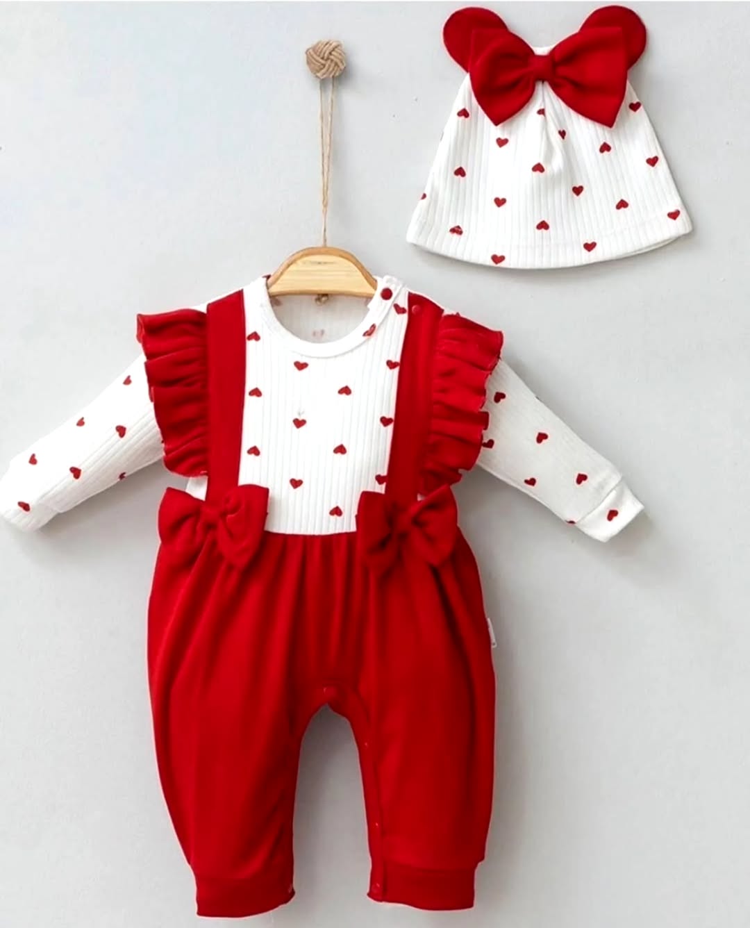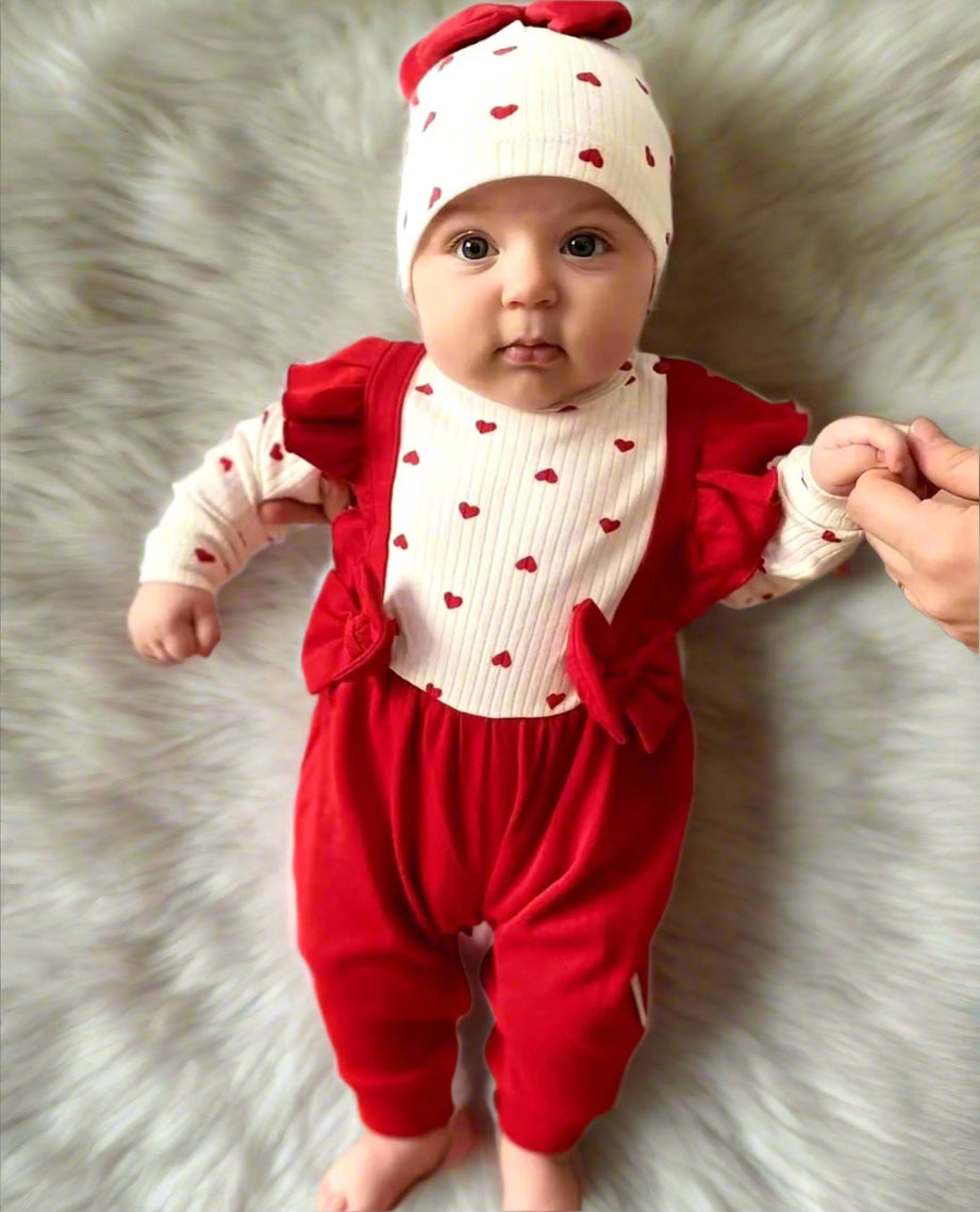 Un set plein de tendresse avec un haut à petits cœurs, une salopette rouge à nœuds, et un chapeau oreilles + nœud assorti. Le look parfait pour une séance photo ou une sortie spéciale.